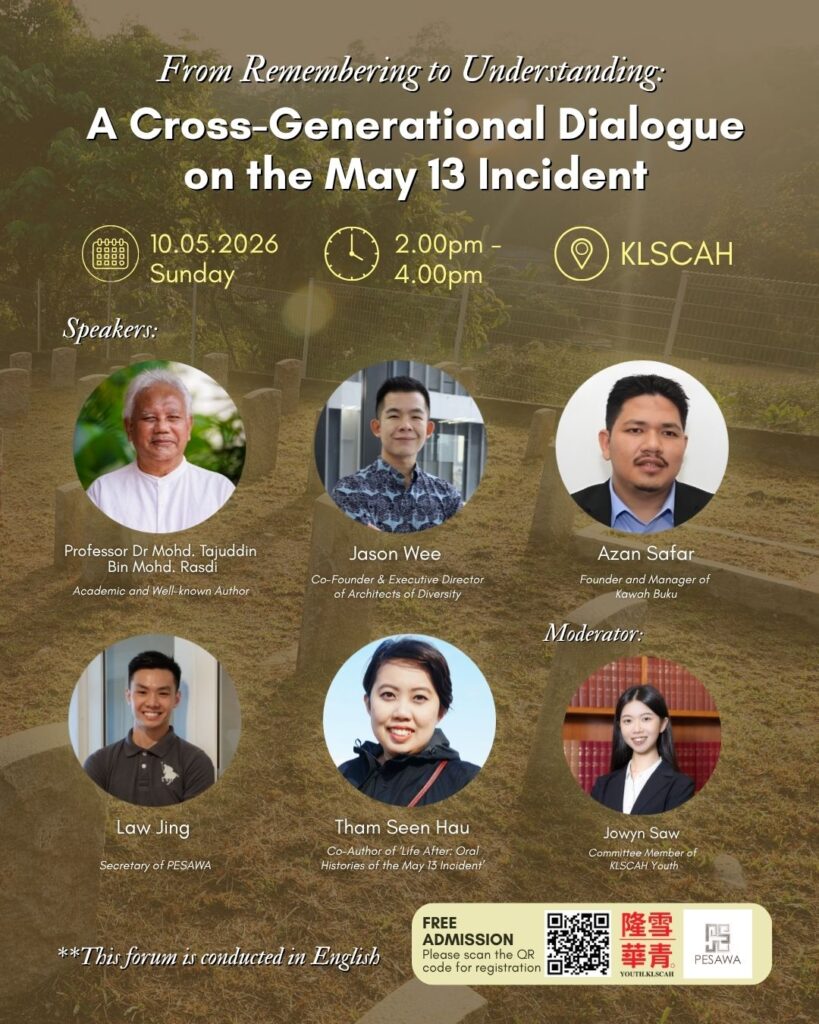 In response to this, the Friends of Kuala Lumpur and Selangor Heritage Association (PESAWA) will organize an English-language forum titled “From Remembering to Understanding: A Cross-Generational Dialogue on the May 13 Incident.” The event will be held on Sunday, 10 May 2026, from 2:00 PM to 4:00 PM at the Cheng Yi Auditorium, KLSCAH.